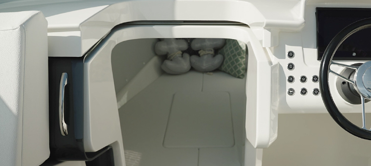 Mit geräumigem Cockpit, Schlupfkabine, Liegefläche am Heck und zwei wählbaren Antrieben ermöglicht die LEX790 Freizeit und Entspannung der Extraklasse inklusive Aktivitäten wie Wasserski.